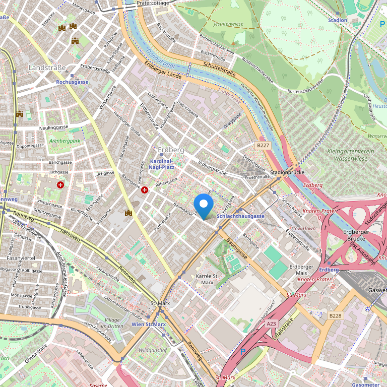 Отель расположен в оживленном деловом районе Landstrasse (3 округ Вены), в 4 остановках на метро от центра Вены, в 3 км от Stephansplatz / City, в 3,5 км от «Messe (Exhibition) Wien», в 30 минутах езды от Austria Center Vienna, в 1,5 км от автострады A4. Рядом с отелем расположена трамвайная остановка Petrusgasse, станция метро Kardinal Nagl Platz - в 700 метрах.