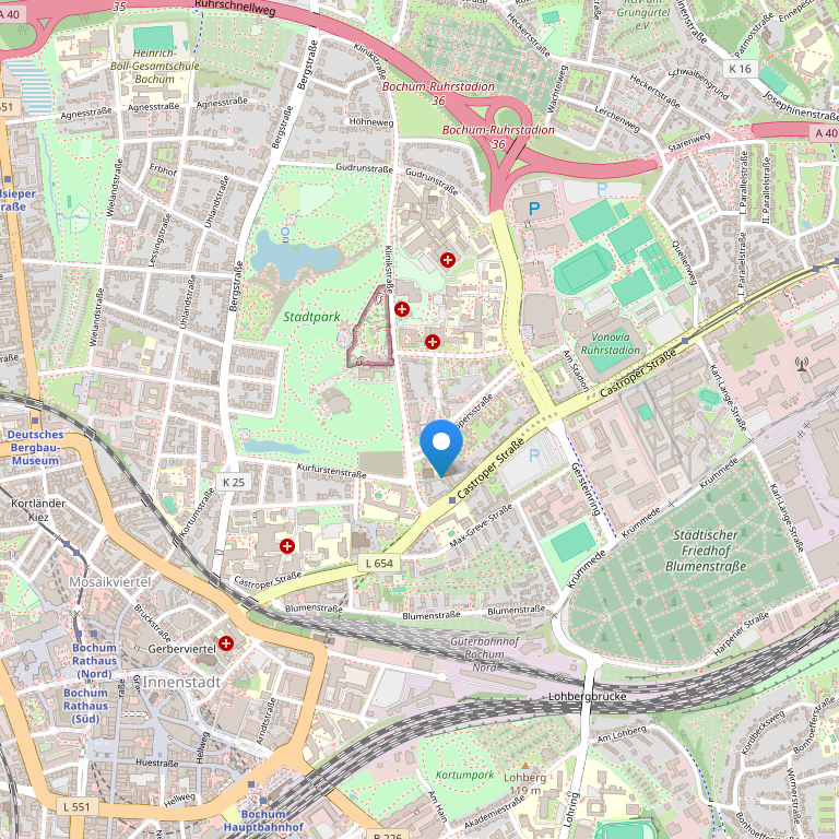 Отель расположен в спокойном месте, в парке Stadtpark Bochum, при этом недалеко от оживленного центра города. Недалеко от отеля также проходят автострады A40/A42 и до гостиницы вы легко доберетесь на общественном транспорте. В районе, в котором находится отель, находится множество парков, садов и водоемов. Отель располагается недалеко от Дюссельдорфа, Кельна, Эссена и Дортмунда, конгресс-центра Ruhr Congress Bochum и футбольного стадиона VfL Bochum, что делает его идеальным местом для туристов и бизнес-клиентов в поездках по региону Северный Рейн-Вестфалия. Международный аэропорт Дюссельдорфа – в 29,2 милях, аэропорт Koeln Bonn Airport CGN – в 54.1 миле, автобусная станция Tierpark - в 0.2 милях, станция метро Planetarium - в 0,3 мили.