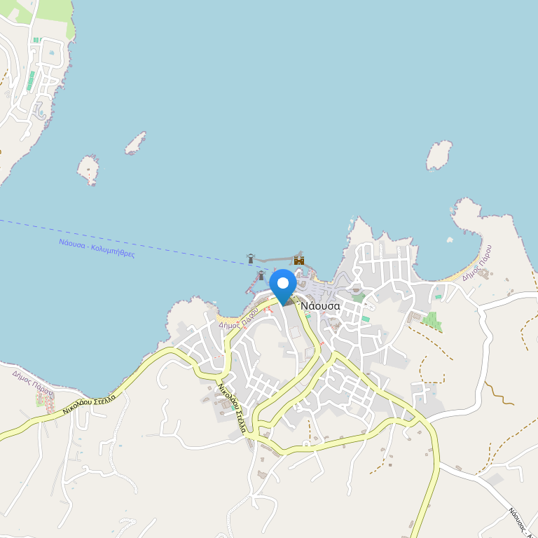 Отель расположен в спокойном месте, и в то же время в центральной части курортного поселка Naoussa на острове Парос, в 5 минутах от центра городка. Буквально в нескольких шагах от отеля находится небольшой пляж, а прямо перед отелем – автобусная остановка. На автомобиле или лодке можно легко добраться до других пляжей. Порт Parikia – в 15 минутах езды на автомобиле, центральная автобусная станция, имеющая транспортное сообщение с другими частями острова, - неподалеку от отеля.