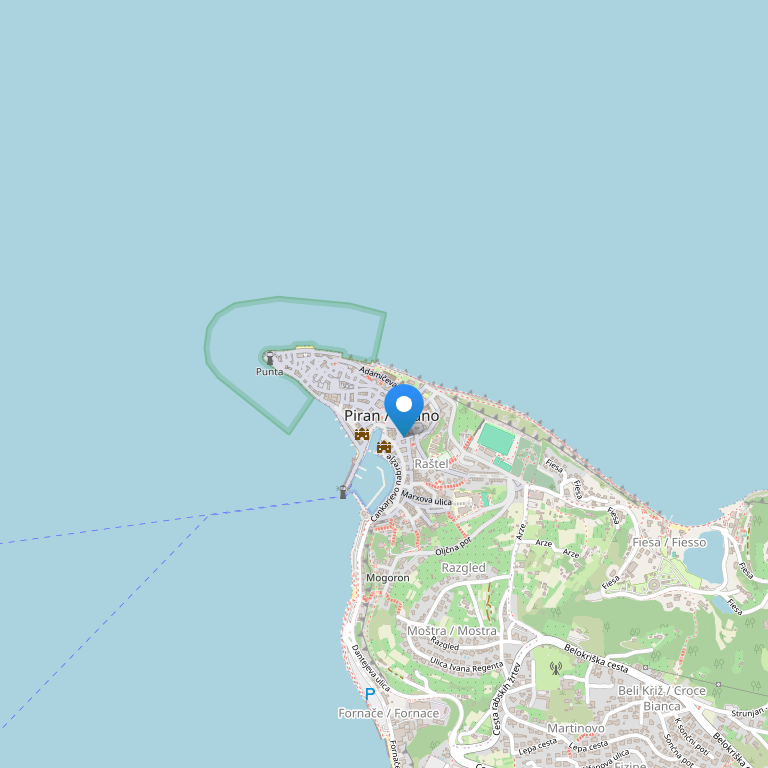 Расположен на центральной площади старинного городка Пиран, от которого до г. Порторож - 3 км, до г. Копер - 15 км.