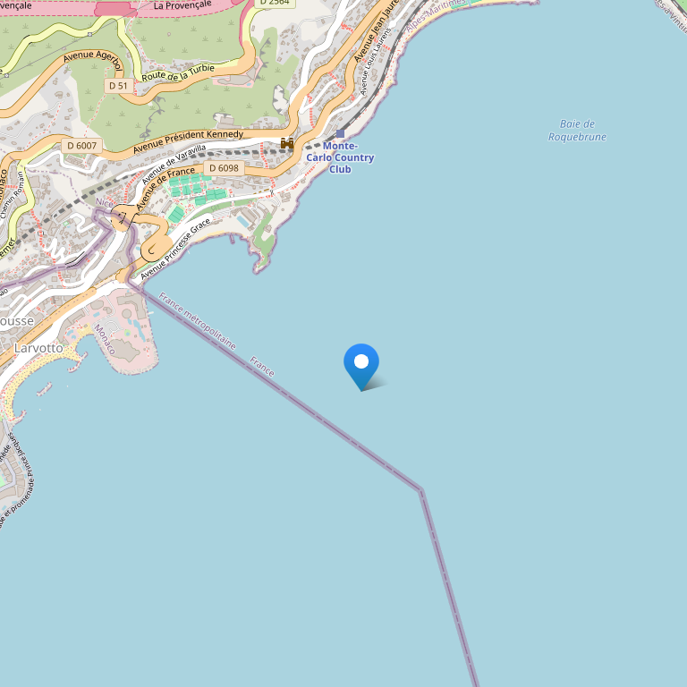 Отель Monte Carlo Beach расположен на побережье Средиземного моря, в 35 минутах езды от Ниццы и в 500 метрах от границы с Монако, в закрытой бухте. Менее, чем в километре от отеля проводится ежегодный теннисный турнир Monte Carlo Masters. Международный аэропорт находится в 30 км от отеля.