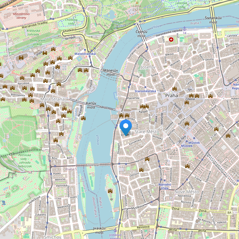 Отель расположен в тихом переулке, в историческом центре Праги - Старом городе, всего в двух шагах от знаменитого Карлова моста, Староместской площади и Национального театра, в окружении художественных галерей, музеев, старинных-безделушных магазинов, уютных ресторанов и торговых рядов, в 10 минутах ходьбы от Вацлавской площади и Еврейского квартала.