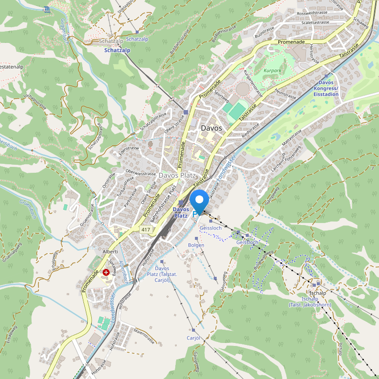Отель расположен рядом с площадью в центре Давоса, недалеко от подъемника Brämabüehl-Jakobshornbahn, до других лыжных зон можно добратться на автобусе, который останавливается у отеля.