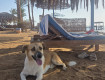 Возьмите пожалуйста вкусняшку мясную собаке, живёт на пляже, коричневый с белым, добрый пёс.