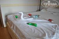 В отель прибыли примерно в 12:00, нас встретила русско-язычный админинстратор,заселили сразу.В агенстве заказали фемели рум,так как ездили с родственниками(мы с мужем и брат мужа с женой).НОМЕР очень удачный(1330) с видом на море и территорию отеля.В номере было две комнаты, в каждой комнате свой балкон и ванная комната.Мебель конечно не новая,но мы не ставили себе цель найти недостатки,поэтому,ничего плохого сказать не могу.В номере все исправно работало:сантехника,кондиционер,телевизор(2 русскоязычных канала) и холодильник.Так что за заселение 5+++++
