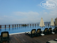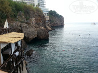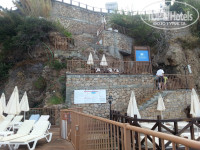 Сам бассейн не большой, чистый,лежаки занимают с утра, если нужно прям у бассейна, ну а подальше, всегда можно найти свободный. К морю ведут несколько пролетов ступенек, на каждом уровне есть лежаки. Спуск к морю удобный,оборудован лестницей, но сразу глубоко, да и волны бьются о скалы. С маленькими детками я бы не советовала, будет неудобно и глубина большая, да и по ступенькам тяжеловато будет подниматься, спускаться, ну а для взрослых (не имеющих проблем с ногами)даже полезно, ножки потренировать. На одном из уровней имеется прокат дайверского снаряжения,можно сзять маску, трубку, ласты напрокат(за 1 предмет 5 евро). С маской смотреть конечно особо нечего, малюсенькие рыбки..камушки, но для разнообразия разок можно поплавать. Море не всегда было спокойное, пару раз вывешивали красный флаг, запрещающий купание. Внизу на платформе размещен стенд, на котором на нескольких языках расписано при каких флагах купаться безопасно. Кстати рядом с отелем был обычный городской спуск к морю, для всех желающих, так местные жители купались даже при больших волнах, не боялись. Ну а если хочется пляжа, то есть мелко галечный городской пляж Коньялты и Лара, но до обоих нужно ехать, пешочком далековато будет топать.
