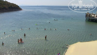 Пляж конечно, подкачал. Это реально узенькая полоска песка и два ряда стоящие почти вплотную друг к другу лежаки. За 21 день мы ни разу не лежали на пляже. Обычно, занимали лежаки у ближайшего бассейна, и потом, гуськом шли уже на море. Кто-то писал про ежей. Взяли с дуру с собой на всех каралки, не нужны они там абсолютно! Вход в море песчаный и пологий, для детей самое то. Практически до конца понтона можно дойти, погрузившись только до пупа, дальше уже идет глубина. Волн нет, но вода, не смотря на разгар лета холодновата. На пляже также есть одно ощутимое неудобство – там нет бара, и за напитками придется каждый раз ходить вверх по лестнице к основному бару. А, до снек-бара идти и того неудобнее и дальше.