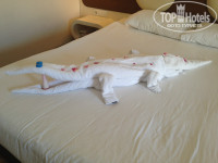 Размещение. Мы прилетели утренним рейсом, в отеле были в 9 утра, естественно нам сказали "ждите", не смотря на то, что в паспорт мы засунули 10$. Впрочем, разместили нас не в 14-00, а в 12-00, что уже порадовало, но для этого нам пришлось каждый час подходить на ресепшн и напоминать о себе. Все прелести номера можно увидеть на фото, простыни были чуть драные, полотенца с дырками, но все чистое, сухое и аккуратно разложено. Номер нам дали почему то с 2 отдельными кроватями, хотя ясно было, что мы пара, одна кровать стандартная, вторая чуть побольше. Мы пошли было ругаться и требовать переселения, но, как и всем,нам сказали: приходите завтра, на что мы плюнули и остались жить там, сделав перестановку по своему вкусу. Единственное, что напрягало-это бесконечное хождение по длинным коридорам, так как жили мы почти в самом конце корабля. Иногда там жутко воняло каким-то дихлофосом, видимо, тараканов травили, а один раз мы обнаружили около нашего номера, извините, кошачьи экскременты, но это было уже почти к концу отдыха, так что мы не особо удивились.