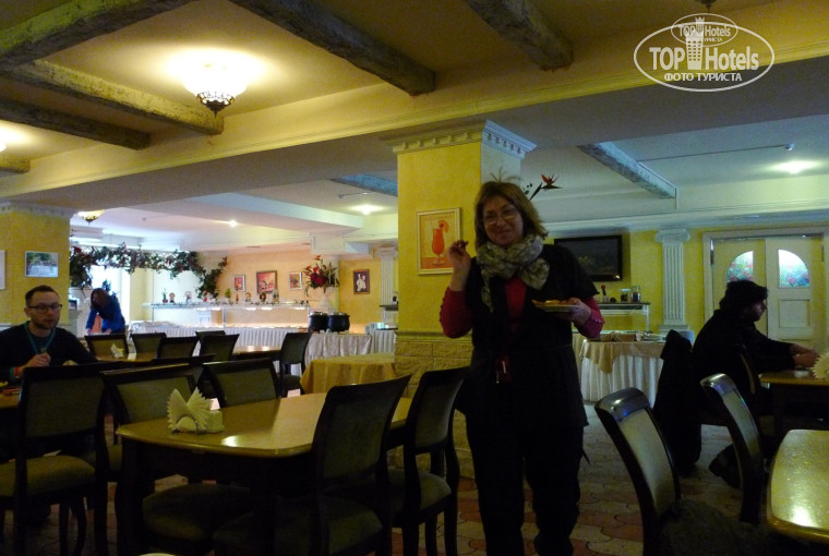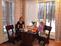 Завтрак. Завтрак и прочие радости для желудка находятся в отдельном здании. Зимой с детьми не очень-то удобно. Завтрак в формате шведского стола довольно разнообразный: были и сосиски с макаронами и омлет без плесени и сухофрукты и молочные продукты и каши два вида. Только кофе растворимый. Натуральный, видимо, за отдельную плату. Народу три человека, всего хватает (не забывайте, это будни). Выпечки никакой не было. Печеньки там, булочки... Обед. Тоже шведский стол, много майонезных салатов, мясных блюд три: печенка, мясной гуляш в подливе и малюсенькие кусочки куры которые мы все забрали (около 6 штук) очень вкусные, кстати. Понятно, что в выходные их не хватает. Первые блюда есть, сладостей нет.
