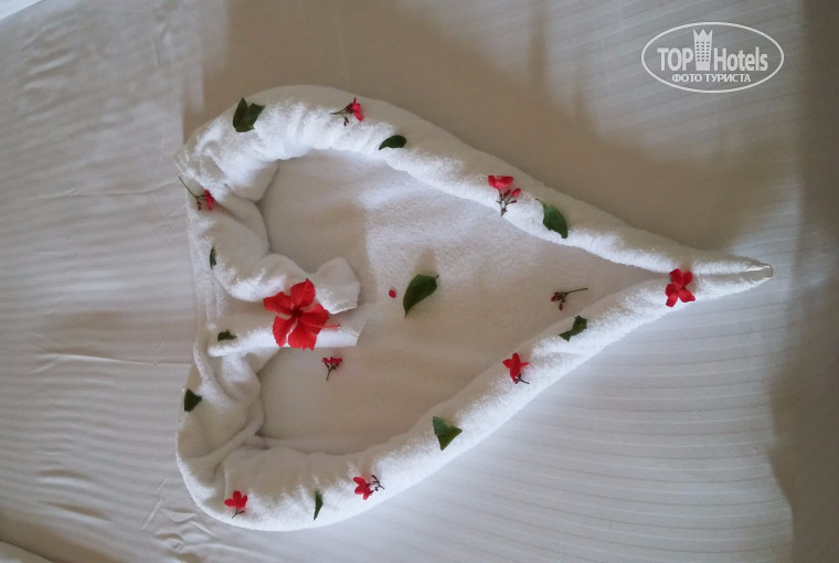 В номере все, как обычно - мебель, ТВ (плазма). Обращаю внимание отдыхающих - номера с большой кроватью только на втором этаже и БЕЗ балкона. Нам сдвинули 2 кровати, и наши больные спины не разу не напомнили о себе, ну никакого дискомфорта. Уборка каждый день. Еще один милаха - Ahmed каждый день крутил лебедей (даже слон был) и оставлял букеты местных цветов, всего за 1 дол.
