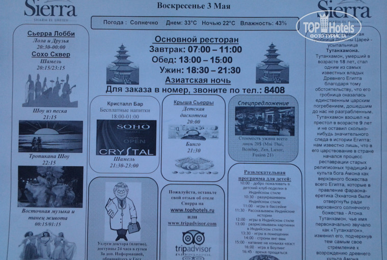 Еще дают программу на день- где какие шоу, потом программу на каждый день на ресепшен брать самим и инфо где кушать: ресторан, вечером Акуна Матата и Чино, напитки- куча баров описана. На Сохо напитки- Кристал бар, Английский паб, Сиерра фонтана бар.