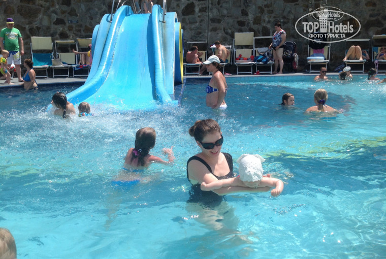 В отеле самый лучший во всем Крыму бассейн, точнее 3 бассейна ( большой 50 метром, детский и глубокий с вышкой для прыжков. Во всех чистая морская вода подогретая до 28 градусов. Можно даже на море не ходить.
