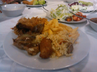 Ужин (с 18 до 20): картошка фри, картошка вареная, рис, макароны, курица (ножки и бедра), свинина (в первые дни была очень вкусная, а потом стали подавать полусырую), мясо тушеное, рыба, ребра свиные, резанная капуста (белая и красная), натертая морковка (через раз), маслины, огурцы, помидоры, 2 вида супа, иногда давали перетертый баклажан, салат из перца, фасоль с томате, салат с солеными огурцами, йогурт (похоже, что тот же, что и на завтраке стоял), компот (один раз набрали ребенку клубничный компот, а он горький), арбуз, сокосодержащий напиток, мороженное.