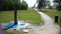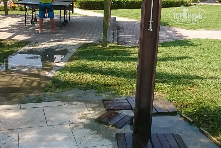 Большой минус - за неудачно расположенные дУши около бассейна. Видимо, строители хотели обойти закон природы, гласящий: вода должна куда-то стекать, а иначе образуется лужа. Но здесь же греки, которые не любят напрягаться, и воде предоставлена полная свобода. Около дУшей нет ни стоков, ни канавок - просто ничего нет, образуются огромные моря воды, вода целыми днями стоит прямо на дорожках, а чтобы люди могли мыться, в эти лужи положены кое-как какие-то дощечки. Халтура, ей-богу, достойная деревни. Но здесь, в четырехзвездочном отеле?..