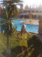 Про еду: работают 4 ресторана, итальянский только ужин там классная пицца, вообще еды навалом, говядина, утка, курица, индейка, рыба, морепродукты , салатов куча, пироженное очень вкусное, фрукты( бананы, яблоки, виноград, груша, дыня, арбуз, изюм, даже раз попало на ужин целые дыни)Есть Азиатский ресторан, любителям острого кто любит. Да, кто любит сметану там её нет.Соки были нормальные, но не везде. Пей сколько хочешь. Мороженное дают в двух барах с 12-17 час в начале отеля возле 3 корпуса и в самом конце за горками, дают всем и детям и взрослым, тоже сколько хочешь.Пиво кто любитель, нормальное пить можно, холодное, из бутылок и кеглях.