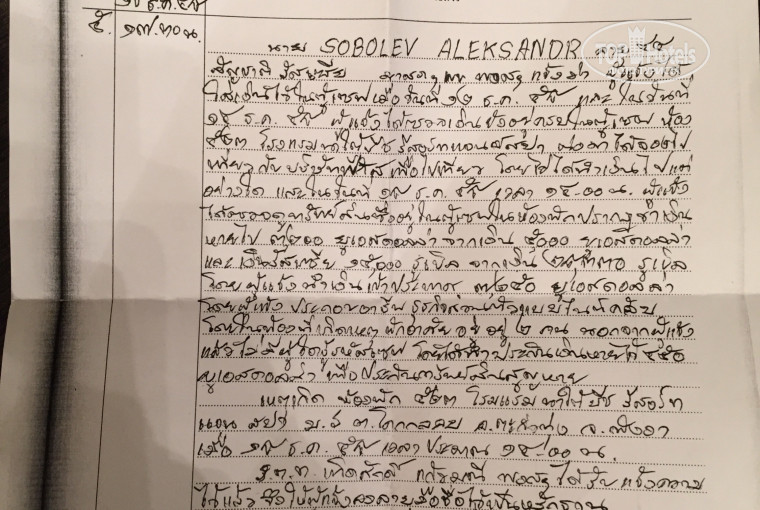 Но это все только "цветочки" и предисловие к той истории, ради которой пишу этот отзыв. Заселившись в отель 12 декабря мы, как обычно, сразу убрали в сейф в номере документы и бОльшую часть наличных денег ( доллары и рубли); оставив себе на расходы определенную сумму, которую муж носил при себе, частично обменяв на баты, частично оставив в долларах; так же при себе всегда были банковские карты. Также в сейфе лежали ваучеры на приобретённые экскурсии. Каждый день в сейф мы не открывали, поскольку не было надобности. 14 декабря муж доставал ваучеры на экскурсии, все было в порядке. 18 декабря муж полез в сейф за очередным ваучером и обнаружил, что значительная часть денег пропала - из отдельной пачки 5000 долларов осталось 1800, из 27000 рублей осталось 12000 ( то, что было мелкими купюрами). Также в сейфе лежал мой кошелёк с 1000 долларов и небольшой суммой в рублях, который не тронули. Документы также остались на месте. Мы, разумеется, немедленно позвонили на ресепшн и пригласили в номер представителей отеля; пришёл русскоговорящий мальчик , начальник отельной СБ и ещё какие- то сотрудники. Мы изложили суть ситуации, на что сотрудники отеля похлопали глазами и заявили, что это невозможно. Мы потребовали вызвать полицию, отель отказался, мотивируя местными правилами, по которым мы как потерпевшие сами должны ехать в участок писать заявление, и только после этого полиция приедет на место происшествия. Мы поехали в полицейский участок вместе с русскоговорящих сотрудником и начальником СБ, там в течении двух часов составляли протокол, после чего поинтересовались дальнейшими действиями отеля и полиции. На что получили ответ, что до понедельника (!) никто ничего делать не будет ( происходило это в пятницу 18 декабря, а во вторник 22 мы должны были улетать), а в понедельник приедет полиция и будет снимать отпечатки пальцев и производить другие следственные действия. На наш вопрос, какие отпечатки останутся за два дня в номере, где мы будем продолжать жить и будет ежедневно производится уборка, сотрудники полиции пожали плечами; предоставить нам другой номер на эти дни отель отказался, хотя большинство бунгало рядом с нашим стояли пустые. Персонал отеля, который привезли в полицию для опроса, просто отпустили восвояси также до понедельника. Мы поставили в известность о случившемся отельного гида и представителя турфирмы в Краснодаре, у которого покупали путевку. В течение следующих двух дней мы пытались поинтересоваться, какие действия производит отель для решения ситуации, но вразумительного ответа не получили. Более того, нам сказали, что администрация отеля не несёт ответственности за сохранность ценностей , оставленных в сейфе номера (!), что они отвечают только за сейф, который находится на ресепшн. А нам просто принесли тарелку с фруктами и письмо от руководства отеля , в котором они в качестве комплимента предложили нам посещение СПА на одну персону; предложением этим мы, разумеется, не воспользовались. В понедельник приехала полиция и забрала с собой сейф из номера, после чего нам пришлось повторно ехать в участок и заново давать те же показания. По возвращении из полиции, мы , узнав , что наш вылет перенесли на более ранее время, решили расплатиться по счету. На этот раз счёт проверяли досконально, поскольку доверия к отелю уже, разумеется, не было, и обн