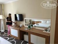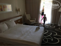 Приехали примерно в 7,00, сдали ваучеры на рецепцию, нас попросили пойти позавтракать, а в 8,00 подняться в рецепцию и возможно нас заселят. Немного отступлюсь, когда читали здесь сами отзывы, то заполнили формы для гестрелейшен и написали на рецепцию свои пожелания по заселению с номером корпуса и ранним заселением, т.к. ребенок маленький. В итоге, позавтракали и поднялись на рецепцию, где нам дали ключи от номера 3208 в том корпусе, что мы хотели, а на гестрелейшене дали пляжную сумку(очень пригодилась) и в номер занесли фруктов! Чемоданы нам в номер занесли и мы начали обживаться.) Номер небольшой, но на 3-х человек вполне, большая кровать, балкон с видом в сад со столиком и стульчиками, ТВ с множеством каналов, минибар каждый день пополняющийся с пивом, колой, спрайтом, фантой, мин.вода, обычная вода, чай, кофе, чайник, сейф, хороший душ, дорогая сантехника Грох, ковровое покрытие! В номер дают по запросу 3 вида подушек - гусиный пух, силикон, ортопедическая. Вообщем номером довольны-тихий, спокойный. Корпуса 4-х этажные, в каждом по несколько лифтов на любой этаж.