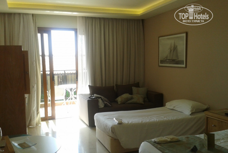 Недавно вернулись с отдыха в этом роскошном отеле. Никогда не писала отзывов, хотя путешественник бывалый :) Но об этом отеле и о людях, работающих в нем, захотелось написать. Путешествовали от Библио Глобус. Прилетели мы рано и, соответственно, в отель приехали рано, в 10 часов утра. Нас встретили, как дорогих и долгожданных гостей: с улыбками, шампанским и влажными прохладными махровыми салфетками, что было очень кстати после дороги и жары. Посадили в электромобильчик и довезли до номера, хотя заселение положено в 14:00 часов. Нас это очень порадовало, не пришлось слоняться по территории в ожидании размещения. Номер тоже порадовал, а вернее, то, что мы заранее у туроператора попросили сообщить в отель о просьбе поставить дополнительную кровать (не хотелось нам с подругой мешать друг другу спать) и в отеле откликнулись на эту просьбу. Все было чисто и красиво, ванная с туалетом тоже сияли чистотой. И вообще уборка производилась каждый день и качественно. Каждый день менялись и полотенца. Не успели мы переодеться и расположиться, как нам в номер принесли вино и фрукты (комплимент от отеля). В холодильнике мы обнаружили воду, различные напитки, орешки, хлопья и т.д. (Мини-бар в номере бесплатный). Так как на завтрак мы опоздали, это пригодилось. Но мы еще не знали, что в лобби-баре можно было взять в холодильнике бутерброды или пирожное, фрукты - это все входит во "все включено". Можно было заказать кофе, чай, напитки. Ну, это я уже отвлеклась. Переодевшись, мы пошли осматривать территорию, пляж и конечно же МОРЕ!!! Оно просто чистейшее и красивое! Плавать в такой воде одно удовольствие. Территория ухоженная и красивая. Персонал трудится честно и хорошо. Все приветливы и улыбчивы, а это, согласитесь, очень важно для всех. Русскоговорящих мало, но есть и на рецепшн (милейшая девушка Болгарка Любочка), отвечала на все возникающие вопросы. В ресторане есть менеджер зала Маечка, тоже говорит по русски. Из уборщиц, также были русскоговорящие (на ломаном русском, но понять можно). Так что все всё понимали, ну и стандартный набор фраз на английском :))) не давали нам там потеряться. Обслуживание было на высоком уровне, как и положено в отеле такого ранга. Официанты в ресторане внимательные и доброжелательные, особенно хотим отметить работу милой гречанки Цампики и русскоговорящей девушки Светланы. Приветливость и улыбчивость, которых, делали наш и без того роскошный отдых, еще лучше. И очень было приятно, когда мою подругу поздравили с днем рождения (так совпало), в номер принесли шампанское и поздравительную открытку с текстом. А также вечером в ресторане на ужине ее поздравили официанты и лично метрдотель Танасис. Спасибо им большое за внимание!!!