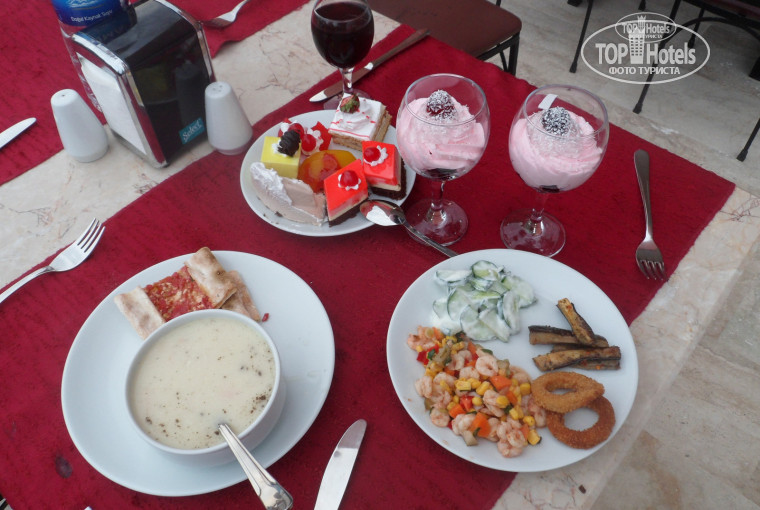 Еда. Есть с чем сравнить. Для 5-ки ассортимент, конечно, маловат был. Но сужу по себе. В первый день хотелось всего попробовать. Хватило меня на пару-тройку дней. Все остальное время я ела только супчик-пюре (белый) с лепешками типа пиццы. Из фруктов были апельсины, яблоки, клубника.