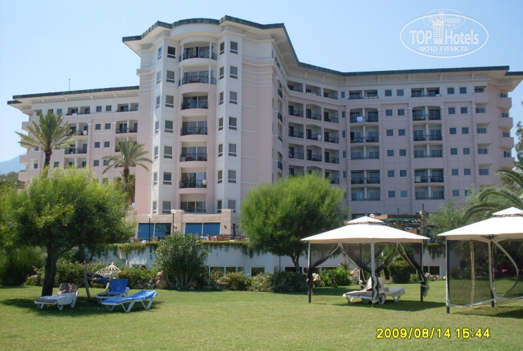Отдыхали с 11.08.09 по 18.08.09. В целом очень хорошее впечатление.Территория очень ухоженная травку и кустики всякие стригут every day, маловато пальм,конечно,но все равно очень миленькая территория. Главное здание (в котором собственно и проживали) в довольо приличном состоянии, номера хорошие, уборку и смену полотенец провдили каждый день без напоминаний, табличек на ручке двери и чаевых. По поводу второго здания ничего сказать не могу внешне очень симпатичный, увитый плющем, вокруг него кустати гораздо больше зелени, чем у главного. Почитав отзывы почему то решили что жить будем обязательно в главном здании, по приезде пытались запихнуть в Anex, но 50$ на ресепшене делают свое дело и вот пожалуйста номер с видом на море. Питание ни плохое и ни хорошее, я бы сказала немного однообразное. В принципе ассортимент блюд в некоторые дни мог быть бы и разнообразнее. Соки из машинок соками назвала бы с большой натяжкой, вино разбавлено капитально. Режим питания был UAI (подразумевал под собой кроме всего прочего 6 иностранных алкогольных напитков, которые оказались местными аналогами) не оправдал себя, немногочисленные иностраннцы оказались умнее тип питания у них AI, о чем говорили оранжевые браслетики. Короче разницы между UAI и AI не обнаружила. Шампанское лучше не пить это просто гадость. О коктелях у барменов имеется свое представление, налить могут в стакан все что угодно, но получается как ни странно довольно вкусно. Проблем со столами за завтраком обедом и ужином нет. POOL bar работает с 10.00 до 24.00, Лоби бар - круглосуточно ( но очень медленные бармены).еще есть закуски в Snack bar с 12.30 до 16.00, который по вечером (кроме среды) превращается в ресторан A'la Carte (итальянский -вторник пятница воскресенье; рыбный-понедельник, четверг, суббота) по предварительной резервации на следующий день. Для любителей поиграть в саранчу ближе к полуночи есть ночной буфет в рестаране с 23.00-23.30. По средам турецкая ночь, в пятницу живая музыка. Все очень приветливые милые люди, улыбаются в 32 зуба. Дети при деле днем кормят рыб, вечером отплясывают с аниматором под одну и ту же музыку. Анимация плохая, но аниматоры красивые. дискотека номинально присутствует, но кроме скучающего DJ и аниматоров там никого нет. Есть кальянчик, очень милый мальчик предложит вам покурить его всего за 10$. Теперь про пляж лежаки занимать приходилось с утра в день заезда, придя на пляж 10 часов свободных уже не оказалось. Впредь были умнее, хотя через пару дней народ как-то схлынул и проблем с лежаками у моря не было, чего не скажешь про бассейн, с 7 часов свободных лежаков уже нет, людей на них в это время вобщем то тоже нет но вещи уже побросали. Море очень очень очень чистое около пирса плавают рыбы что лично мне было не очень приятно (прикормили аниматоры). Пляж меленькая галька, чистый . Вход в море хороший. Позади отеля великолепный вид на горы особенно хорошо видно из моря когда не скрыты дымкой что бывает не часто. На горах растут сосны, очень красиво воздух супер. Карты телефонные дешевле покупать у местных торговцев, а не в отеле и не у гидов.