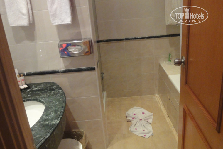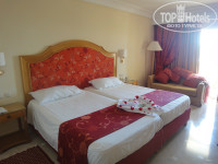 В номере раздельный туалет с ванной(в туалете раковина,в ванной душевая кабинка,раковина,ванна),шкаф,электронный сейф(бесплатно),холодильник с минибаром(пополнение бесплатно каждый день около 15.00 фанта,кола,спрайт,вода с газом и без),чайник чай,кофе в пакетиках,тумбочка под чемодан,стол,тумба под телевизор(samsung LCD),большая кровать с прикроватными тумбочками,диван,балкон с очень мягкими креслами и потрясающий панарамный вид на территорию отеля и море. Уборка в номере прилично каждый день до обеда(мы оставляли на кровати по 1 динару).