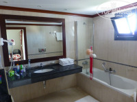 Номер у нас был заказан Family Room, двухкомнатный. Первый вариант не понравился, попросили поменять еще до заселения. Второй вариант полностью устроил. Корпус 30, номер 664. Первый этаж, два выхода (дверь и патио к бассейну), одна комната большая и одна поменьше за перегородкой с внутренней дверью. Кондиционер, холодильник, телевизор с одним российским каналом ОРТ и несколькими греческими, удобные кровати, большая ванная комната (совмещена с туалетом). Из недостатков - много мелких муравьев с улицы. Но по заявлению их можно потравить (на ресепшн объяснили ситуацию, через пару часов пришла женщина, обработала все места внутри и снаружи).