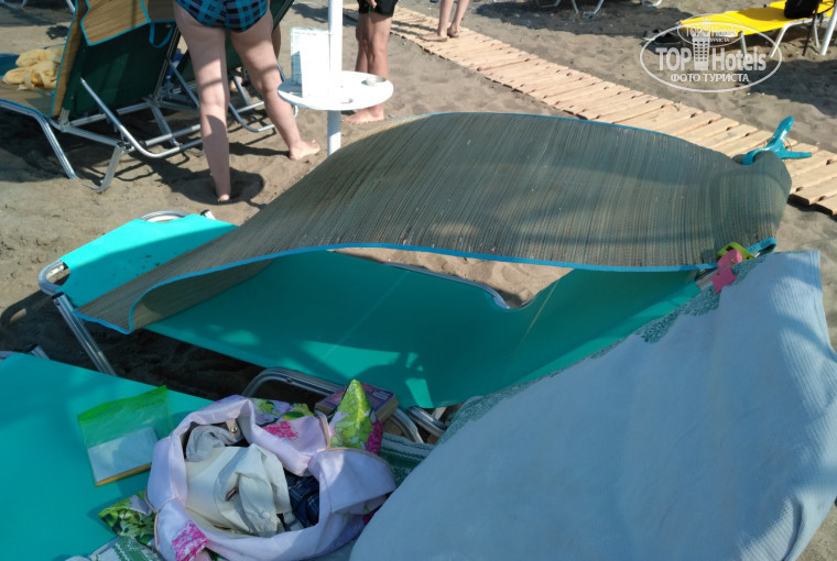 Наличие бесплатных лежаков и зонтов большое преимущество этого отеля, но зонтики очень не плотные (полупрозрачные) и почти не дают тени при здешнем ярком солнце. Сильный, но тёплый ветер дует здесь почти все время, при этом сильного волнения на море нет. Полотенца и другие вещи приходилось придавливать камнями потяжелее, чтоб не удуло. В магазинчике, позднее, мы купили большие пластиковые прищепки, которыми закрепляли наши полотенца к лежакам. На пляже имеется душ и раздевалка, но нет никаких спасателей.