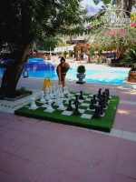 Много лежаков и на пляже и у бассейнов. Места занимать нельзя, это радует, что всегда можно найти везде место. Море безупречно, как всегда. На территории два больших бассейна, один в аквагорками, которые работают два раза в день, горки не большие, обычные, стандартные.