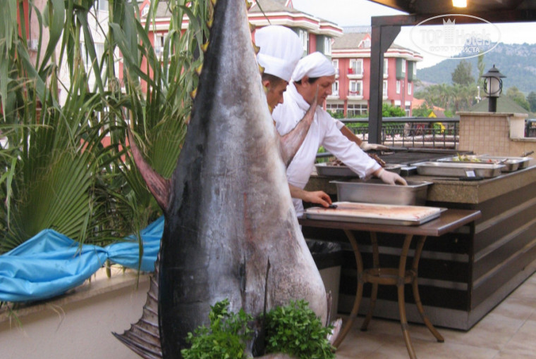 Питание отличное,довольны и дети и взрослые,несколько раз были даже морепрдукты и один раз огромный двухметровый тунец,масо которого при вас жарят на мангале;фруктов много и разнообразные(арбузы,дыни,виноград,персики,абрикосы,сливы,груши,грейпфруты,апельсины),сладости вне конкуренции,мяса много любого,разумеется кроме свинины,мест в ресторане всегда достаточно.В некоторых отзывах читала , что мало мяса и фруктов,официанты не опрятные,наверно мы отдыхали в разных отелях.Шеф-повар Махмед всегда всех очень радушно встречает у входа в ресторан. Что удивительно для Турции- алкоголь был приличным, но только в ресторане,в баре лучше не брать.