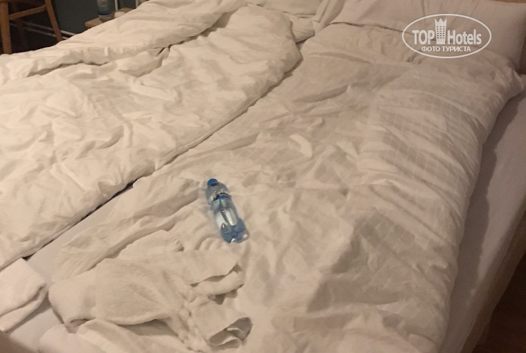 По поводу уборки: номер не убирали, пол не мыли ни разу, пыль не вытирали, под кроватью были огромные клубы пыли, кровать нам заправили всего 2 раза, как именно её заправляли - на прикрепленном фото. Честно говоря, такого безалаберного отношения к уборке я еще никогда не видела! Полотенца (очень застиранные серые (бывшие белые) нам поменяли только один раз после того, как мы их положили на пол.