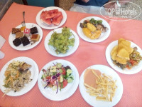 Еда разнообразная, на любой вкус, различные виды салатов, рыба, сладости.