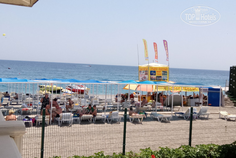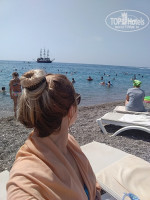 Пляж-мелкая галька, ходить по ней легко даже деткам. Шезлонгов бывало впритык на пляже, особенно под навесом.