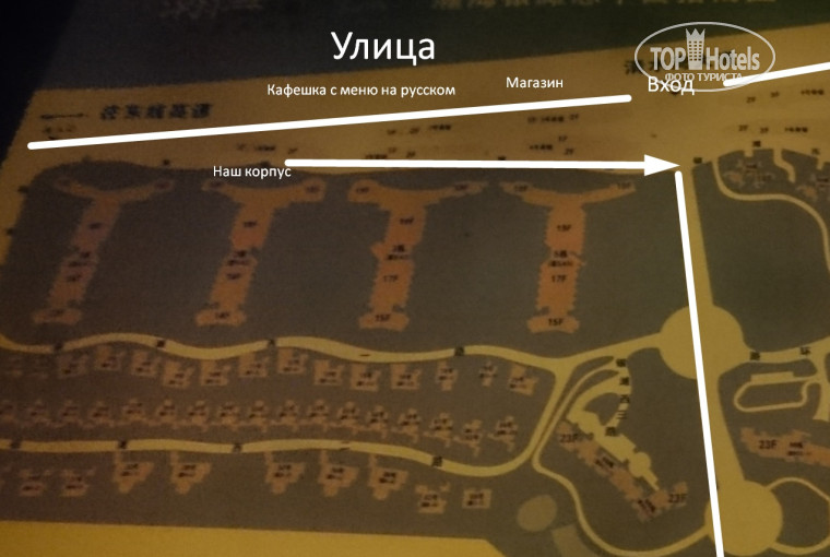 Мест где поесть очень много рядом, выходишь с территории отеля и налево, и напротив куча ресторанов и кафешек, но всё на китайском и сами они не говорят по русски, так что выбирать приходилось по картинкам на свой страх и риск, либо через переводчик на телефоне. Есть одна кафешка, где в меню есть подсказки от руки по русски, на стороне отеля, не переходя дорогу. Морские гады в ресторане напротив в аквариумах, но дорого.