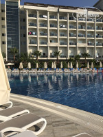 Про перелёт и трансфер не пишу, это тема туроператора, не отеля. Прибыли в 9 утра, на ресепшн сказали номеров свободных нет, придётся подождать часиков до 12. Ок, разгар сезона, в целом готовы были, надели браслеты и пошли завтракать. В итоге в 12 нас готовы были заселить, но номер на бассейн, нас не устроил (читала отзывы о шуме) , дали 10$ и попросили тихий номер, портье сказал что хороший номер освободится через час, мы согласились ещё подождать и в итоге весь отпуск наслаждались тишиной и спокойствием! Не представляю, как можно было спать в номерах на бассейн или в тех, что на веранду выходят. Сразу скажу, что человек я разумный , читать умеющий и интернетом владеющий, поэтому искренне недоумеваю, когда в отзывах об этом отеле пишут минусы-отсутствие территории и автобус до пляжа. Нет, ну правда, вы едете в отель и не в состоянии почитать предыдущие отзывы? Я все прочитала , поэтому для меня сюрпризов не было, но опыт с передвижением к морю на транспорте был первый и мне он не понравился))) в расписании заявлено, что он ходит каждые пол часа, по факту так и было, но пару раз автобус уходил на 5-7 мин раньше, или наоборот, приезжал чуть позже, в целом не страшно, в крайнем случае можно пешком. Территории действительно нет, но повторюсь, я об этом знала, потому никаких сюрпризов не было. Питание хорошее, что есть, то есть, все вкусно! Не скажу, что выбор огромный, но вполне разнообразно. По средам рыбный день-лосось на гриле, мидии в кляре, роллы. Я не любитель, а муж остался доволен. Уборка в номере практически отсутствует. Я не педант (возможно поэтому меня это не сильно расстраивало), но правда грязно было. Во время отдыха был др, отель в качестве поздравления подарил бутылку вина и тарелку фруктов. Тарелка стояла 6 дней (грязная), сами м отнести было не сложно, просто решили посмотреть-когда ж Ее заметят ))) не заметили, пришлось на ресепшне попросить-не услышали, точнее услышали со второй попытки. Белье меняли один раз за 11 дней, нас это вполне устроило, полотенца не меняли вообще. Видимо, решили-не испачканные и ладно) пляжные полотенца довольно таки потрепанные, разномастные, и вот что не понравилось, так это то, что обмен их в течении дня невозможно! То есть только получение утром и сдача вечером, на мой взгляд -странно, ну да ладно, тоже особо не напрягло. На бассейне анимация присутствует, стандартная. Детская тоже есть и тоже ничего особенно, го ребёнку нравилось, это главное. Лежаки у бассейна лучше пораньше занимать, мы рано приходили (часов в 8 уже), места много было, а вот часам к 9 уже проблематично. На море ездили всегда после обеда, мест свободных полно. На пляже есть бар и мини-ресторан, но там ни разу не ели, ничего сказать не могу, бар до 18 часов работает. Вообще, на мой взгляд, очень не хватает бара непосредственно рядом с бассейном. Тот, что в располагается в стрит-баре, работает с 10-12, в остальное время (утреннее)за напитками приходится подниматься в лобби, а так как в купальнике в лобби мне ходить не позволяет совесть, мне было неудобно. Напитки, кстати, на любителя . Пила мохито, дня через три началась изжога) муж пил джэк дэниэлс-тоже не особо, сказал. Соки как всегда в Турции -юппи, еле отмыла ребёнка от красителя))))несколько раз выбирались на автобусе в город, на рынок и в тц, там посещали местные ресторанчики-впечатления хорошие. Вай фай отвратительный, нор
