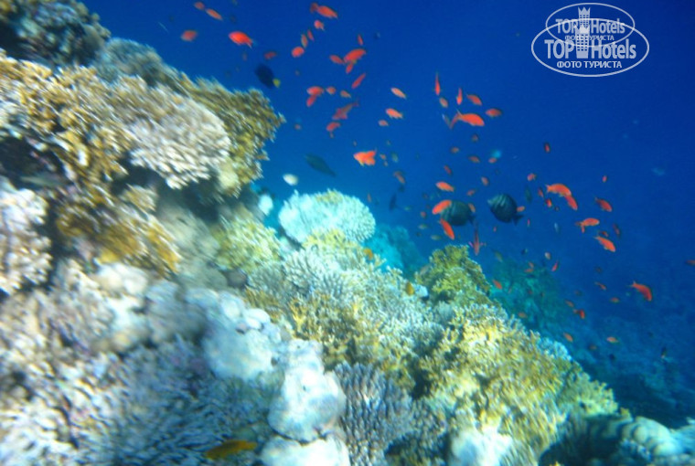 Море. Мы купили коралловые тапочки в магазинчике у отеля за 3 доллара, была какая-то акция. На пляже такие стоили 5 или 6 долларов, но без них там делать нечего. В основном, туристы, которые плавали с маской и ластами, заходили в море через островок, слева от пляжа (об этом писали и в отзывах). В первый день мы так и поступили. Путь от пляжа до дальней оконечности островка занял столько же времени, сколько путь от островка по острым камням до глубины, к тому же, мы немного порвали тапочки. Да, там неплохой подводный мир, но много и каменистого дна. В следующий заход отправились до рифа вдоль блоков с правой стороны пляжа. Там камушки и дно гладкие, кораллы начинаются только у самого дальнего блока. Там же начинаются и ежи. Там, правда, видели ядовитую рыбу-камень, она под цвет коралла, сидела на камне у блока, отличить ее от коралла можно только по форме рыбы. Там заход действительно хороший, несколько шагов между кораллами, и можно лечь на живот и плыть. Вот там красивейшие, уходящие в море ступенями кораллы, были даже черные кораллы, кораллы очень необычных форм (как в Шарме) и удивительный подводный мир. Видели разнообразных рыбок, крылатка висела в одном месте после обеда, дельфинчика, акуленка (возможно, существо-то было одно и то же, просто, в воде на расстоянии не очень ясно). Плыть от этого места надо направо, в сторону строящегося отеля. В сторону Азуров- несколько метров идут красивые кораллы, а потом опять каменистое дно с отдельными кораллами. Конечно, при наличии прибойной волны вход в море затруднен как слева, так и справа, но при небольшом уровне спортивной подготовки особых проблем не будет.