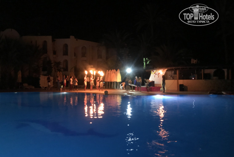 Устраивают ее перед вечерней анимацией. Точнее это даже не дискотека, а элегантные танцы для людей элегантного возраста... Молодежная дискотека начинается в 23:00 на цокольном этаже. Заглянули туда один раз. Музыка играет, кондиционеры работает, народууууу... никого. Ну и алкоголь там, как и во всем отеле после 23:00 платный (можно алкоголь взять с собой). Не особо дорогой. Мы купили бутылку вина за 25 динар. Это другие вина. Не те что разливают бесплатно. Два раза в неделю (вторник и пятница) дискотека на пляже. Вот там веселуха!!! Мы попали только на пятницу.