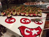 Питание на мой взгляд для взрослых хорошее, для детей в принципе тоже есть (но просто детки особо не могли себе ничего выбрать). Было питание детское в баночках, но мы не брали его, так же было два вида печенья, было и диетическое меню, стоял миксер, рядом в холодильнике молоко. Мясо, рыба, раки (иногда были), салаты, котлеты, овощи, фрукты, для сладкоежек вкусное пироженое. На утро приготовят вам омлет с чем душа пожелает. В течении дня можно полакомиться в кофейне, где пекут очень вкусные вафли с шоколадом, вишней. Также там можно покушать мороженое. В обед и на ужин в главном ресторане тоже на десерт можно взять мороженое. Возле моря есть беседка, где пекут турецкие лепешки. Также есть снэк бар, где можно тоже перекусить и выпить прохладительные напитки, чай или кофе. Так же есть вагончик (как бы его правильно назвать), где вам предложат гамбургеры. Питание на мой взгляд разнообразное, можно для себя что-нибудь вкусное выбрать. Пили в основном шампанское, очень вкусное, или коктейли.