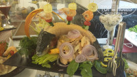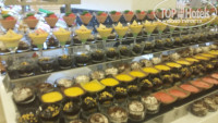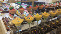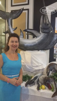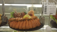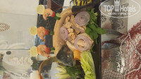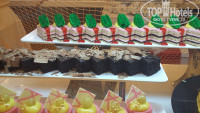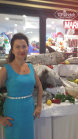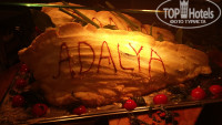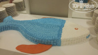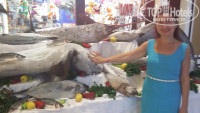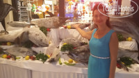 В другой раз один из ужинов был тоже красиво оформлен в стиле средиземноморской кухни: перед входом в ресторан были выставлены огромный тунец (больше метра) и др. огромные рыбины замороженные (выставлю фото), большой торт (тоже метровый)в виде красивой бирюзовой рыбины, кот. мастерски резал стоящий рядом сотрудник кухни, резал так,чтоб остался красивый контур! На трехэтажной "горке" были раки, креветки и подобные морские обитатели, так что для любителей рыбы и средиземноморской кухни здесь рай!
