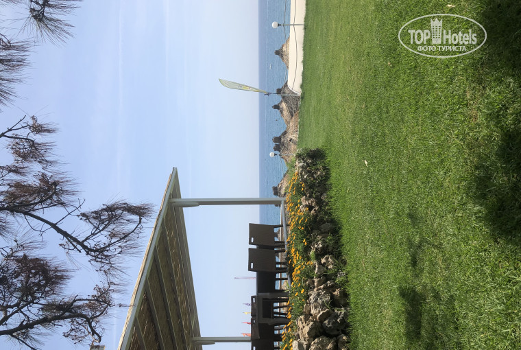 Территория. С этим все замечательно. Приличная территория, зелёная и чистая. Много зелени, все ухожено и очень аккуратно. Большим плюсом является - сосны, которые создают тенек. Три бассейна. Водные горки. В общем за это 5 баллов.