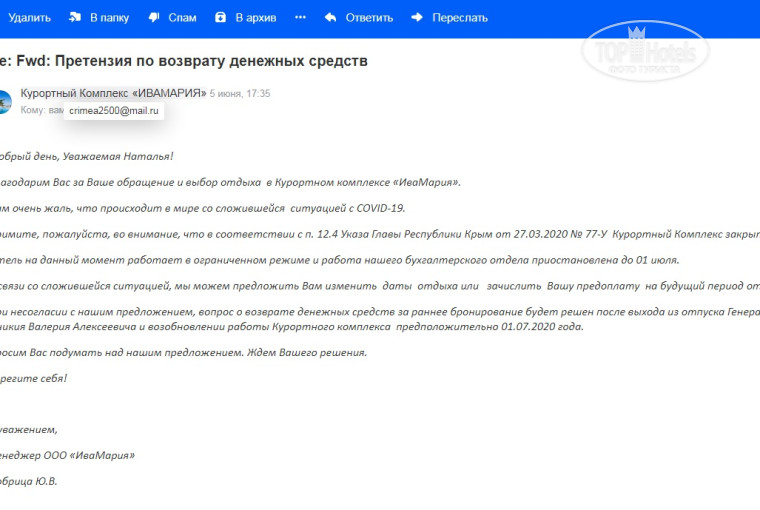 27.05.20 написала претензию по возврату денежных средств в срок до 06.06.20, отель мою претензию проигнорировал, звонила им много раз, писала кучу писем, потом начались отговорки что в отпуске бухгалтер, потом в отпуске директор. 22.06.2020 с меня удержали коммисию в размере 10080 рублей просто ни за что, отель дождался официального снятия карантинных мер по Крыму , изменил договор оферты и удержал с меня комиссию.
