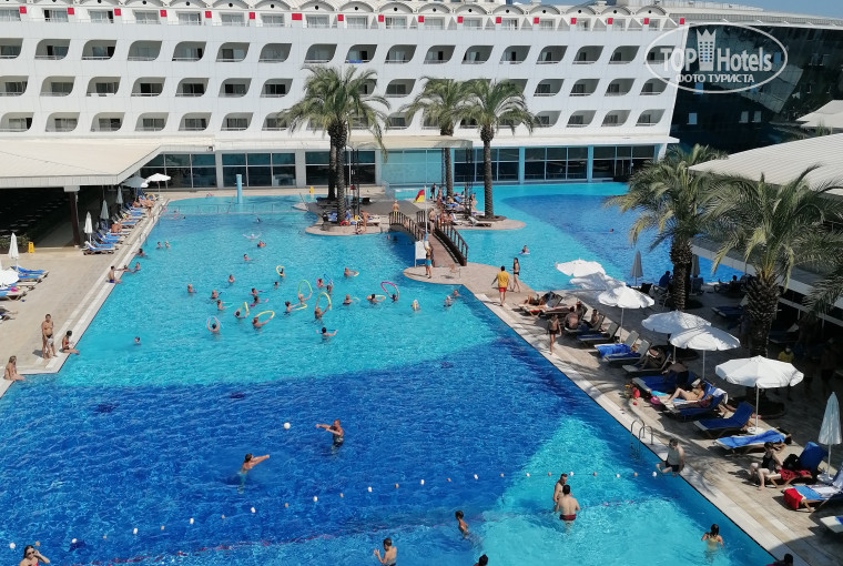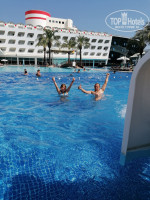 Территория отеля удобная, много роз. Большой бассейн и горки(работают по часам). Лежаки свободные были. С 12:00 работает снек-бар, с 13:00 мороженое и лепешки гезлеме. Вода во всех барах всегда в наличии.