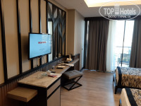 Провели в данном отеле неделю в конце сентября. Заселили быстро, на рецепшен была русскоговорящая сотрудница. Номер свежий, приятный дизайн, вид на бассейн, вдалеке видно море. Раздельный санузел, очень понравился душ - из потолочной лейки вода льёт как с водопада, одно удовольствие им пользоваться. Шампунь, бальзам, гель для душа, лосьон для тела, ватные диски и палочки были в номере и периодически пополнялись. В минибаре вода, кола и фанта.