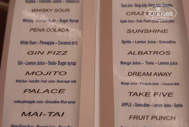 Мы посещали 3 ресторана. Днем работали 2 – Soprano и L Asiatique, а вечером открывался рыбный ресторан Culina. Питание отличное, разнообразное. На завтрак всегда были омлет с овощами и яичница, тут что попросите, то и приготовят. Так же были сосиски, картошка, каши, йогурты, оладушки, выпечка обалденная, ну и конечно зелень, овощи , оливки, сыры и колбасы. Каждый день на обед и ужин разнообразные супы, которые почти не повторялись! А какое было вкусное мясо, не передать словами! Всегда была говядина, очень вкусная рыба в кляре , стейки и кофте на гриле. Так же были перепелки, утка, индейка и курица. Каждый день был картофель в разнообразных вариациях, очень вкусный! Пюре из настоящего картофеля, не из порошка. Так же выпекали пиццу с разными начинками . Еще делали пасту с разными соусами( томатный, болоньезе, острый и сырный). Из фруктов были бананы, яблоки, апельсины, гуава, груши, дыни, гранаты, финики, виноград. Очень вкусный кофе! . В рыбном ресторане были креветки, кальмары, рыба. В общем по питанию все супер! Про алкоголь могу сказать что он весь какой-то на один вкус, что текила, что виски, что ром, нам не понравилось даже в коктейлях. Импортного спиртного нет даже за дополнительную плату. Пиво нормальное, вино тоже более или менее. Все алкогольные и безалкогольные напитки делают бесплатно.
