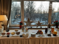 Очень понравился их ресторан "L'Atelier". Завтраки просто чудесные - разнообразный "шведский стол" плюс готовят горячее на выбор. Нарезки, салаты, выпечка, блины, молочные и кисломолочные продукты, разные топпинги, приличный выбор фруктов - были и выноград, и хурма, про стандартный набор уже и не говорю, соки, морсы, чай с кофе... В общем, можно сытно позавтракать, а заодно и пообедать)) В день рождения дарят сладкий комплимент - безусловно, приятно. Интерьер в ресторане очень изящный. Ужин оказался просто великолепным - позиций в меню не так много, но все они интересные и очень вкусные. И качество приготовления, и подача - на "пятёрку"))