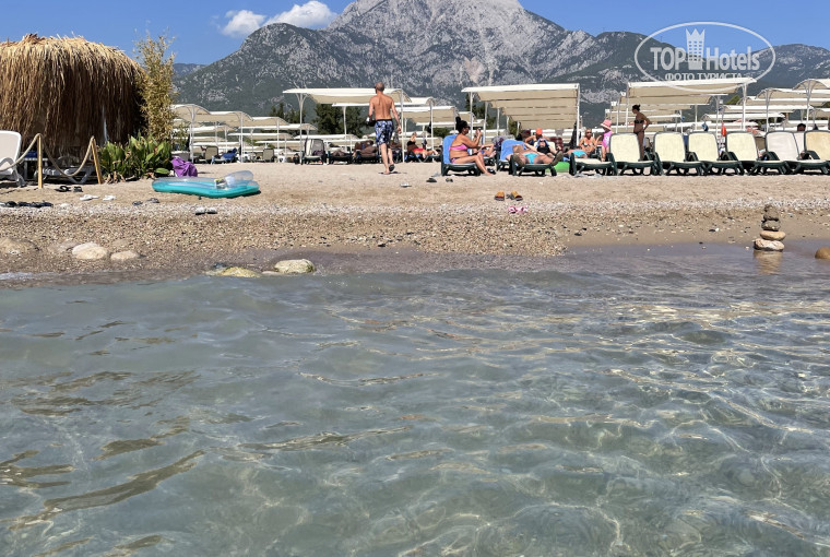 Пляж чистый, ухоженный. Иногда ходит маркетинг прошлого века, навязывая дубленки, но сильно никто не беспокоит. Лежаков всем хватает, но на первой, второй линиях мы ни разу не лежали, обычно уже в конце. Приходили около 10 утра. Море тёплое, прозрачное, вид на гору потрясающий. К камешкам мы быстро привыкли, даже дочка без проблем вылезала из воды.