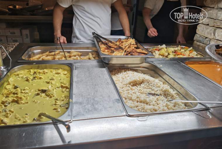 Полотенце пляжное платно. Интернет 5 евро 3 дня. Сейф хоть и в номере есть, но платный. Номера маленькие, очень простые, не все лампочки горят. Еда никакая. Воду не дают. Кулер был в ресторане, но не всегда в нем была вода. Вечером как - то в 18 закончилась и появилась только на следующий день. Кто - то пишет про супер повара, но это ужас какой - то. Приложу фото горячих блюд одного из вечеров: суп, курица карри, картошка, рис, и тесто с рисом, и тесто с петрушкой. Все. Напитки на ужин платные : чай, кофе. Утром эти напитки можно пить. Других напитков вообще нет. Завтрак заявлен с 8.00 до 10.00 пришла я как _то в 8 и было пусто, при мне раскладывали нарезки, яйца жареные появились только в 8.30