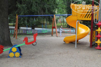 На нижнем этаже детская комната. Детская площадка хорошая. На берегу водохранилища много лежаков, песочный пляж, выдают в прокате полотенца. Купаться можно. Кресла-качалки, шатер с небольшим баром напитков, мангальная, где приготовят шашлык по заказу. также есть там здание ресторана, платный, и никто там не ужинал.