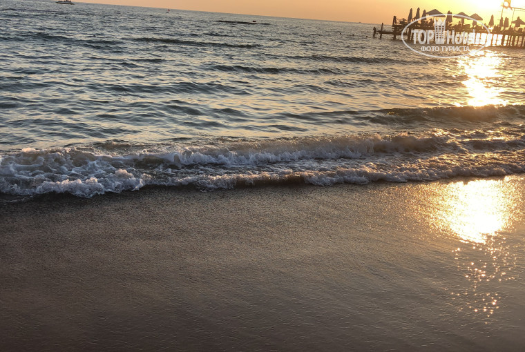 Сам пляж с очень хорошим и пологим заходом, большое количество шезлонгов, достаточно широкий, оборудован душем и раздевалками, все очень удобно. Но, стоит немного пройти в море, и сразу натыкаешься на ОГРОМНЫЕ! камни в воде. Без специальной обуви очень больно наступать на дно. Я очень старалась найти место, где камней меньше, но видимо, там такого места нет, потом я попробовала зайти в море с пирса. Поплавать, конечно, без болезненного захода в море можно, но для тех, кто любит понырять тоже не вариант, т.к. можно наткнуться на острую глыбу в воде - не советую! Бара на пляже нет, бар есть у бассейна (не далеко находится от пляжа), за напитками нужно ходить туда. Также рядом с пляжем есть небольшой аквапарк (три горки) и басен, есть одна маленькая горка для детей.