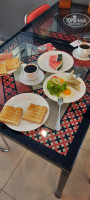 Яйца жареные, овощи свежие ,арбуз,чай кофе .