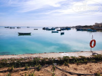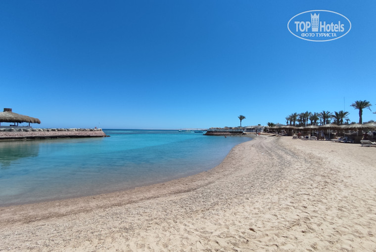 Очень большой, широкий, лежаков много, нет скученности. По факту пляжей несколько. Мы в основном ходили на косу, там есть лагуна и очень удобный вход в воду с плавным заходом и хорошей глубиной. Дно песчаное, специальная обувь не нужна. Вода идеально прозрачная, но в апреле была бодрящая (+23). После жары зайти охладиться самое то. К воде быстро привыкаешь. Рыбок там особо нет. Цвет воды очень красивый. Лежаки удобные, большие, матрасы мягкие есть столики для вещей и крючок на зонтике. Симпатичные зонтики с соломенными шляпками. Есть ограждения от ветра, но нам они почти не понадобились. Ветер только пару дней дул, в остальные дни был или штиль или слабый комфортный ветерок. С основного пляжа не купались. Там мелко, народ шел до буйков и все время было по пояс.